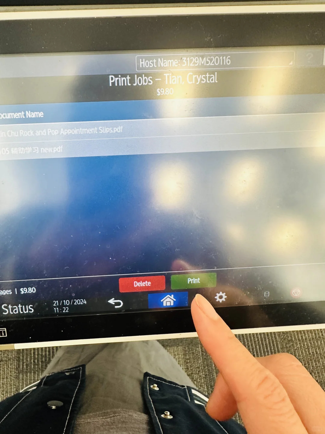 走到打印机前,扫一下图书卡,打印机屏幕输入密码,就会自动显示你的打印任务,然后需要点选一下你要打印的文件,要选一下哈,因为我以为是自动打的,站了半天发现没打…选好了就点击打印,就完成了。 完全自助打印,还是挺方便。i人友好。