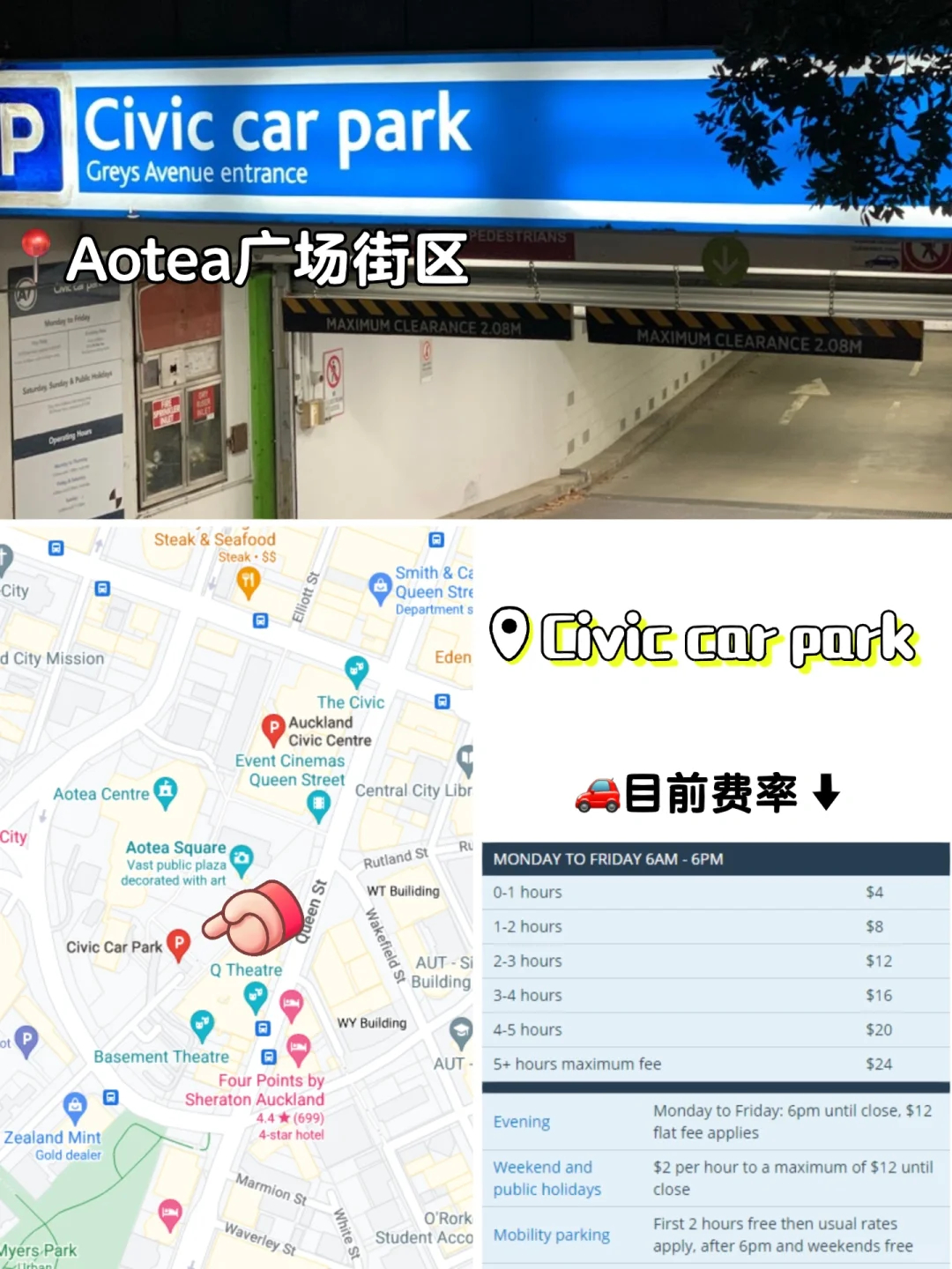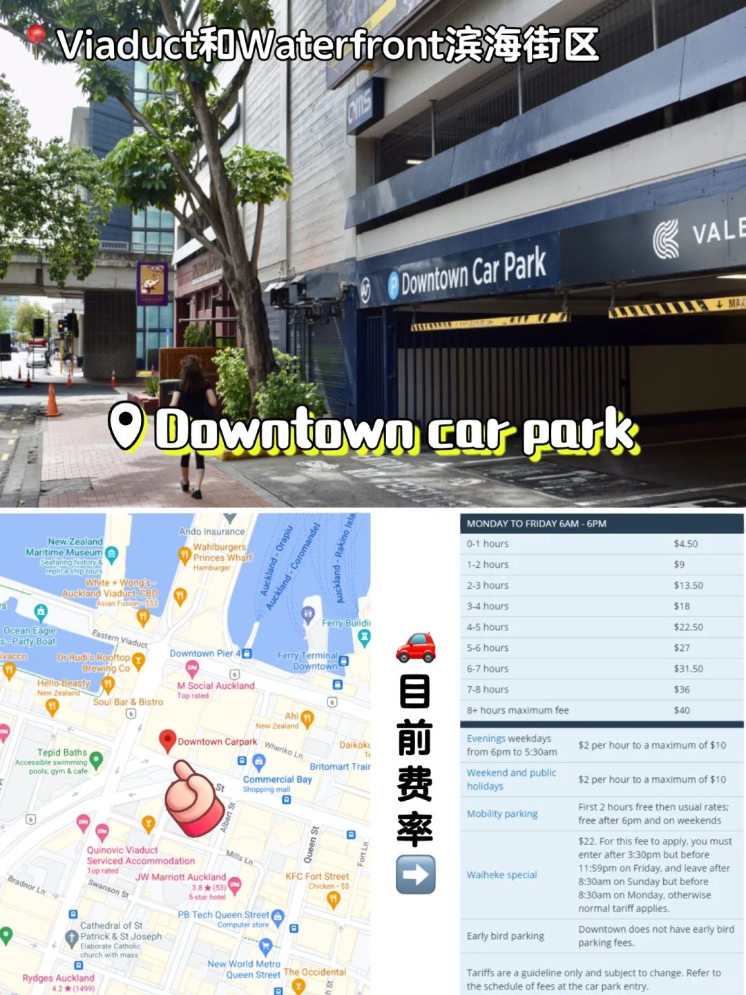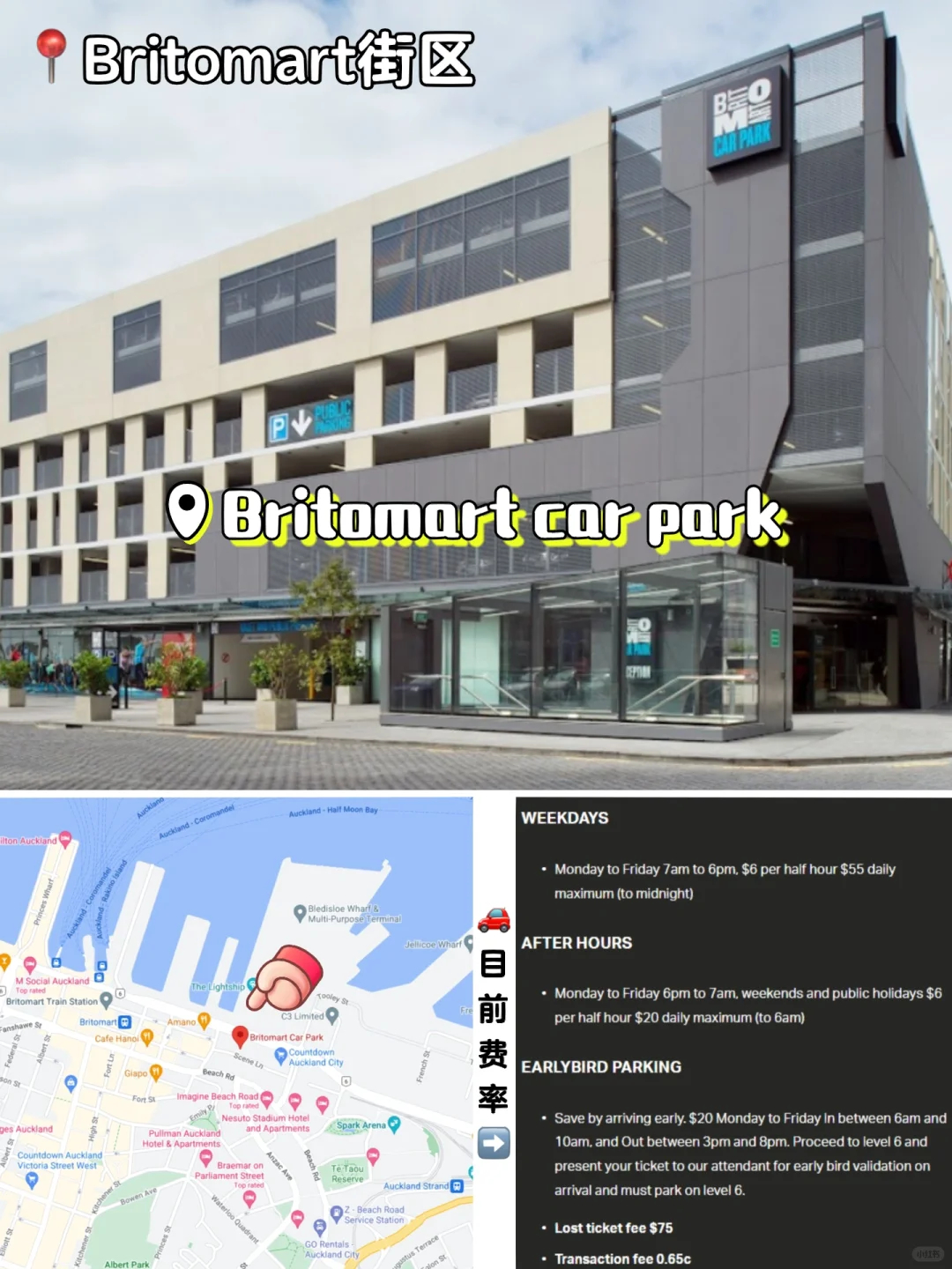 - **Britomart car park**:工作日早上7点到晚上6点,每半小时收费6元,全天上限55元;工作日晚6点到早7点、周末和公共假期则是半小时6元,封顶20元(至早6点)。