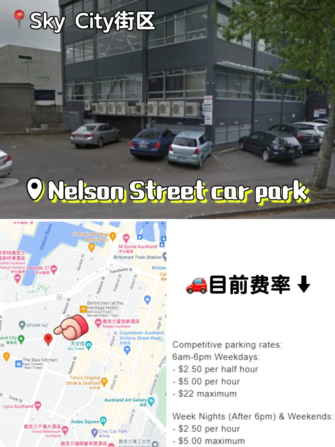 - **Nelson Street car park**:工作日白天每半小时收费2.50元(早6点到晚6点),上限22元;工作日晚6点后和周末每小时收费2.5元,最高5元。