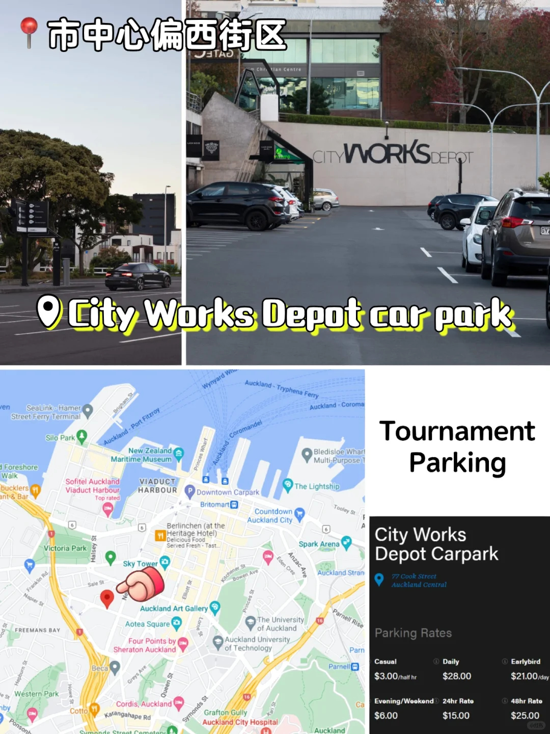 - **City Works Depot car park(Tournament Parking)**:平时每半小时收费3元;夜间和周末停车仅需6元。