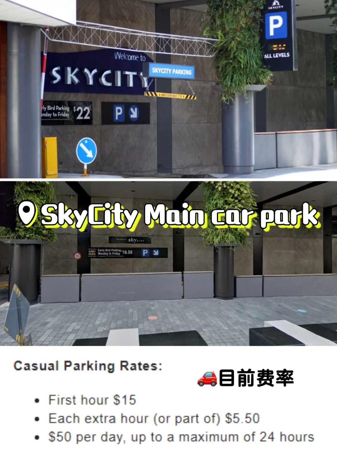 - **SkyCity Main car park**:早鸟停车优惠为13.50元,要求在早6点到9点之间进入,下午3点到6点之间离开(单次进出)。
