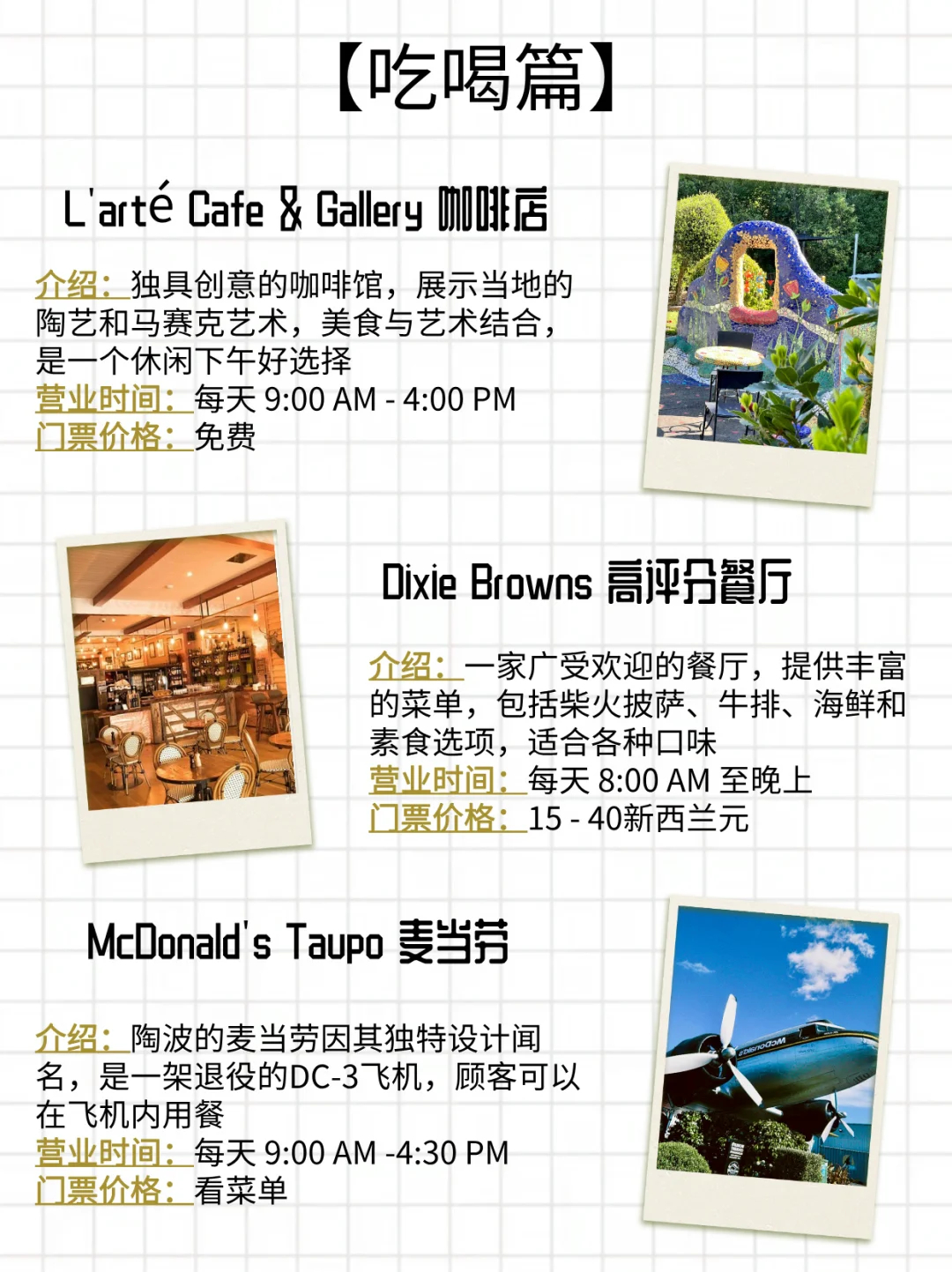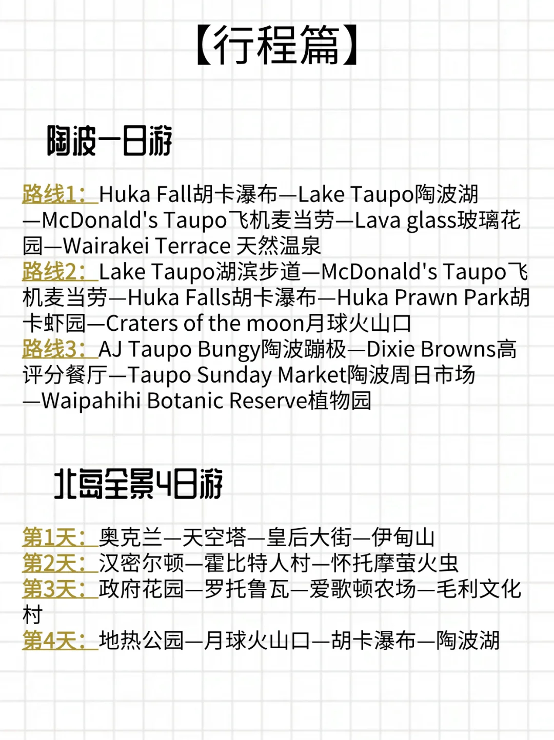 陶波是一个迷人的旅游目的地,虽然它的规模不大,但却拥有充实的精彩活动和美丽的景点。胡卡瀑布以其冰蓝色的水流从断崖倾泻而下,令人叹为观止。月球火山口展现了地底蒸汽的奇观,而陶波湖以其湖边的‘LOVETAUPO’标志成为打卡热点。另外,玻璃花园展示了各种精美的手工玻璃艺术品,令人目不暇接。毛利岩刻是欣赏毛利文化艺术的绝佳去处,推荐乘船或划桨板前往观赏。宁静的Waipahihi植物园则为游客提供一个放松心情的地方。 除了景点,陶波的娱乐活动也同样丰富。泡天然温泉是陶波之行必不可少的体验之一。胡卡虾园提供了亲自钓虾的乐趣,而周日市场则是探索当地艺术和手工艺的好去处。如果你追求刺激,尝试陶波蹦极和跳伞将带给你独特的体验。此外,喷射快艇将在急流中让你感受速度的快感。在美食方面,L'arté Café & Gallery的创意咖啡和高评分的Dixie Browns餐厅是用餐的绝佳选择。 对于计划一日游的游客,可以考虑以下几个路线:路线一涵盖胡卡瀑布、陶波湖、麦当劳和玻璃花园;路线二则是沿湖滨步道,经过几个富有特色的景点;而路线三则包括极具挑战性的蹦极和美味餐厅。若打算深入探索北岛,四天的行程将带你游览奥克兰、汉密尔顿及令人心动的地热公园等地。