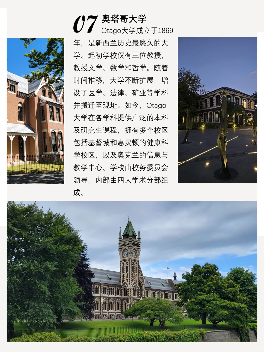 奥塔哥大学是新西兰最古老的大学,成立于1869年,校园内建筑优美,享有极高的教学声誉。