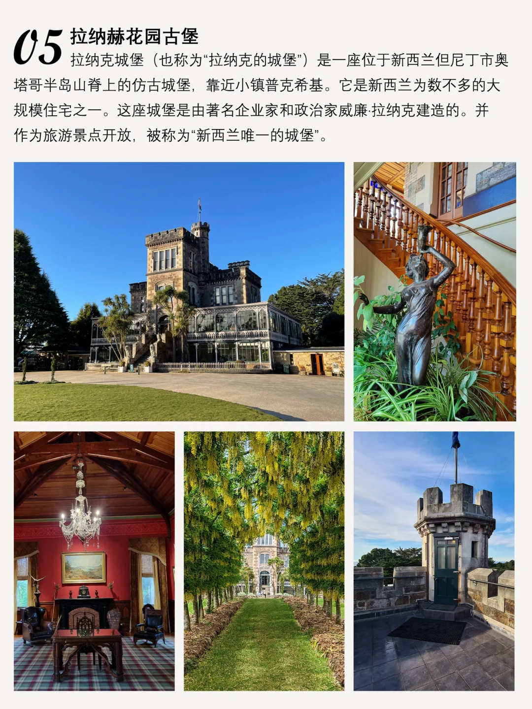 拉纳赫城堡是新西兰为数不多的大型住宅之一,由知名企业家威廉·拉纳克建造,并对外开放,成为了旅游景点,被称为“新西兰唯一的城堡”。