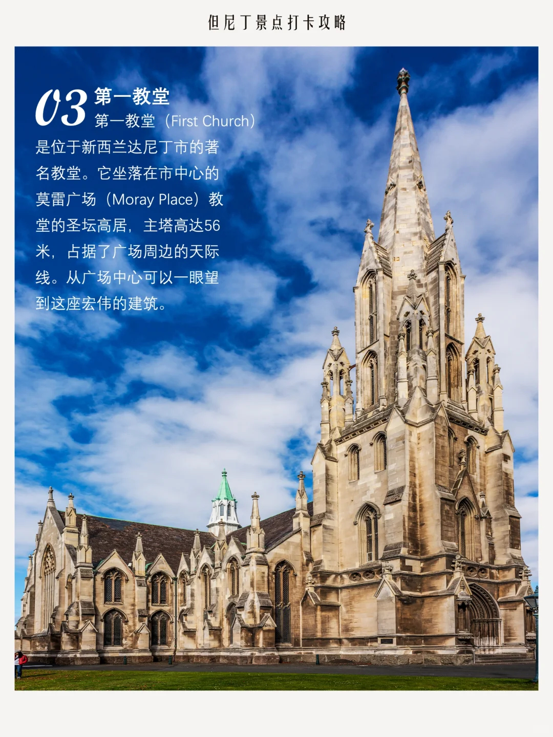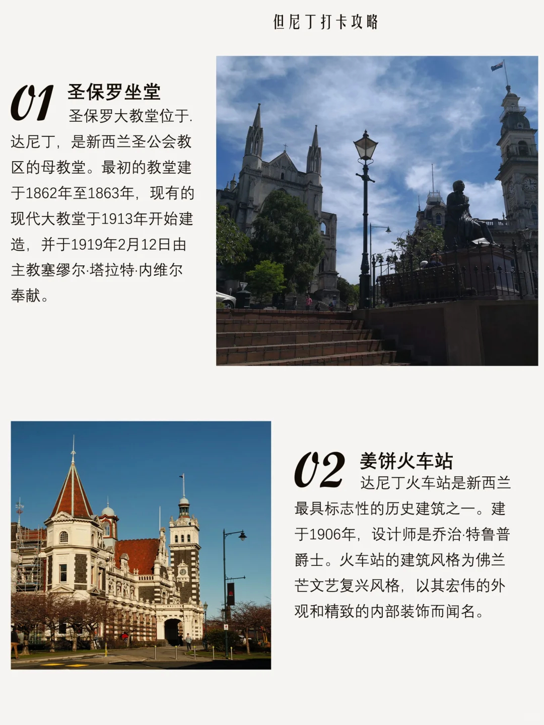 达尼丁火车站是新西兰最具代表性的历史建筑之一,建于1906年,由设计师乔治·特鲁普爵士设计,展现了佛兰芒文艺复兴风格。