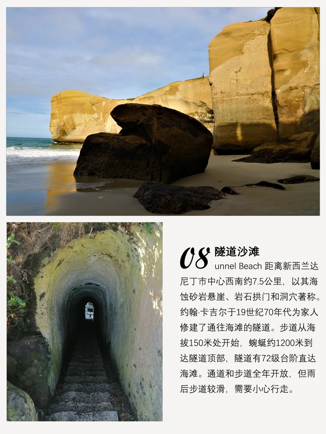 隧道沙滩位于达尼丁市中心西南约7.5公里,以其海蚀砂岩悬崖和洞穴闻名。虽然通道和步道全年开放,但雨后走道较滑,需格外小心。