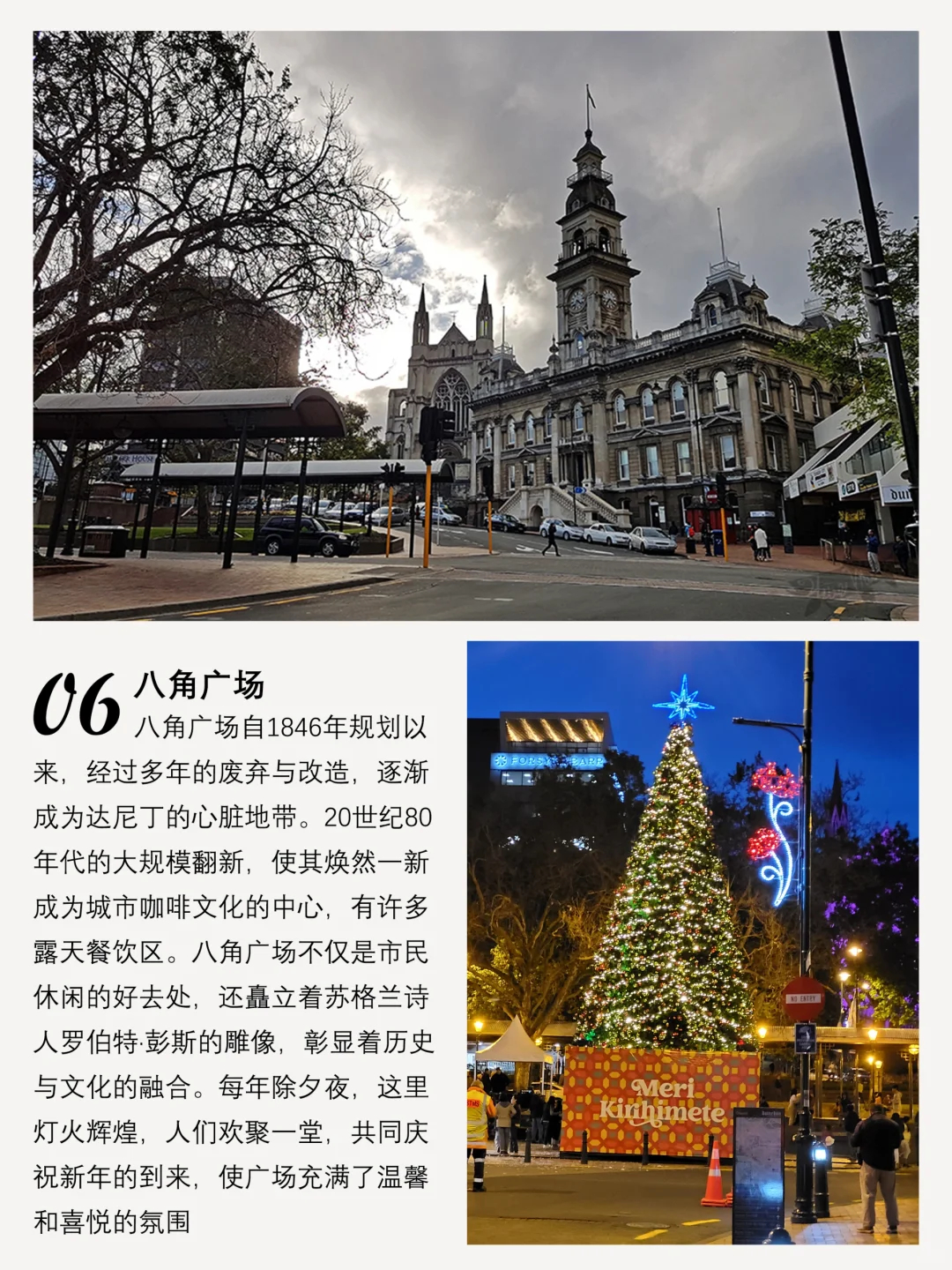 八角广场是达尼丁的文化中心,汇聚了多种露天餐饮区域及历史建筑,每年除夕夜都会有盛大的庆祝活动。